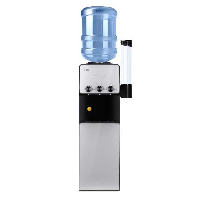 Напольный кулер с электронным охлаждением и вместительным шкафчиком в нижней части. Три крана поворотного типа: для подачи горячей воды, холодной и комнатной температуры. Для подачи воды нужно повернуть соответствующий кран, для остановки подачи — вернуть его в исходное положение. Корпус полностью чёрного цвета, верхняя панель с индикаторами и нижняя передняя панель (дверца шкафчика) со вставками из стекла серебристого цвета.